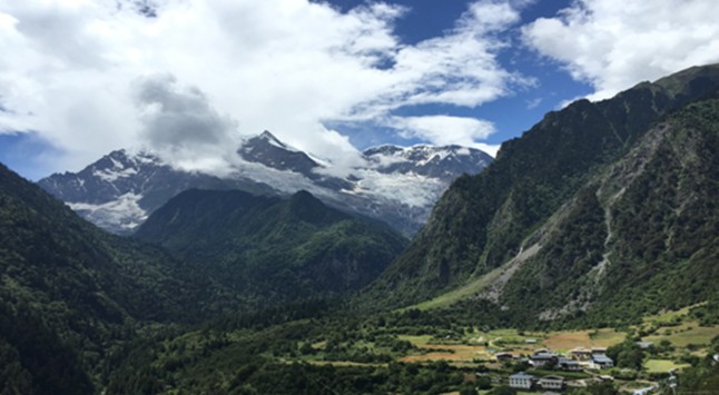 隊(duì)伍在休息站充分休整后,再次出發(fā),前往今天的目標(biāo)地:雨崩村。接下來的路都是下坡,我們更清晰地見到了期待已久的雪山。遠(yuǎn)遠(yuǎn)的可以望見山上的冰川,圣潔的雪峰隱匿在云間。騰舞的云氣、銀白的雪色、蒼翠的山林和挺拔的山峰融為一體,漏斗型的冰川倒掛在半山腰。觀賞著美景,不知不覺間便到達(dá)上雨崩村。見時(shí)間充足,在落腳的旅店休息片刻后,大部分隊(duì)員輕裝上陣決定去神瀑看看。