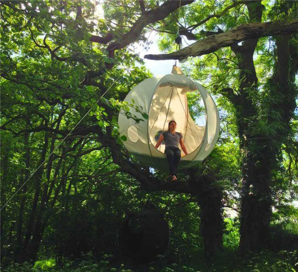 「roomoon」是由 hanging tent company設(shè)計(jì)和制造的球形帳篷,露營(yíng)者可以將自己懸吊在樹(shù)梢上,去體驗(yàn)荒野的樂(lè)趣。公司的創(chuàng)始人 rufus martin 認(rèn)為這款帳篷相對(duì)于市場(chǎng)上的其它球形帳篷是便攜的,安裝比較簡(jiǎn)單。1.8米寬的底板面能夠卷起來(lái)放到汽車(chē)后備箱里。鍍鋅的鏈條可以承重1噸,舉升3米,讓用戶有私人的空間,而且也很安全。